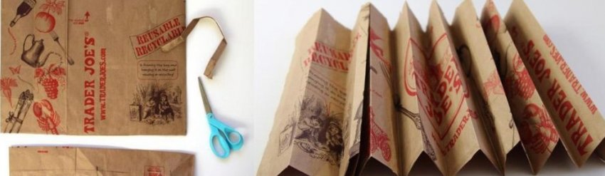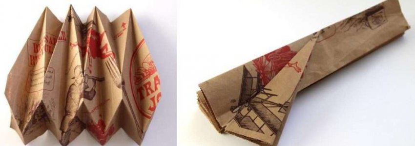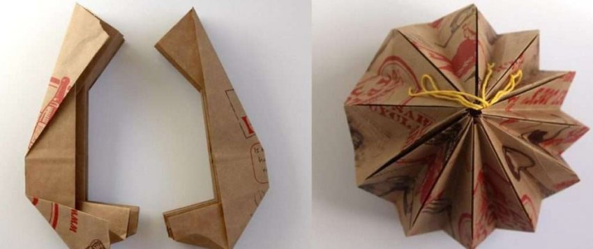 У бумажного пакета нужно вырезать дно и отрезать ручки. Должно получиться большое бумажное полотно, при этом его размеры зависят от габаритов пакета. Поделите получившийся прямоугольник на 16 равных отрезков и затем по линиям сгибов сложите его гармошкой.