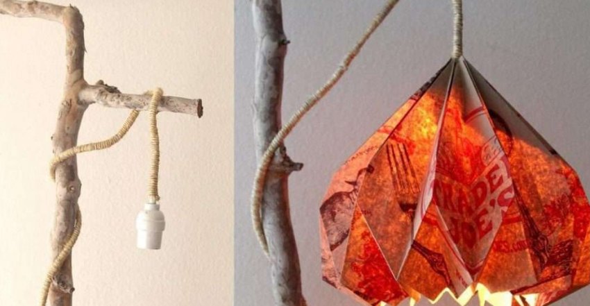 Когда кабель готов, осталось просунуть его через бумажный абажур. Светильник будет смотреться оригинально, если его повесить на декоративную ветку. Такая композиция красиво будет выглядеть в интерьере загородного дома или в квартире. Предметы интерьера из экоматериалов придадут вашему интерьеру нотки природной гармонии и естественности.