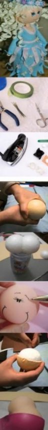 1. Все детали куклы выполняются отдельно. Возьмите для головы шарик из пенопласта и фом бежевого цвета. Нагрейте фоамиран утюгом и плотно обтяните шарик. Лишние кусочки материала и швы соберите в одном месте, чтобы их можно было закрыть волосами.