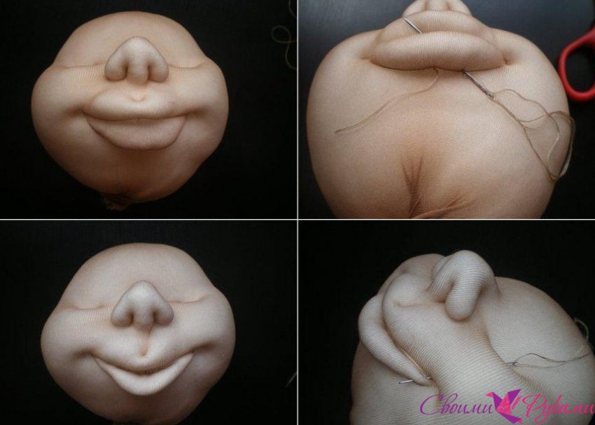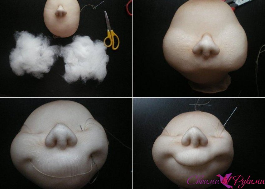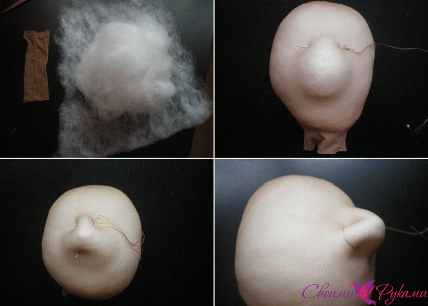 2. Теперь приступите к формированию лица. Для этого из синтепона скатайте шар, вставьте его в обтянутую капроном бутылку и с помощью иголки с нитками сформируйте нос. После этого можете добавить ещё синтепон, чтобы сформировать щёчки, лоб и подбородок. Приклейте глазки, вышейте ротик и придайте подходящее выражение лица кукле. Чтобы выделялась линия шеи, перетяните её нитками.