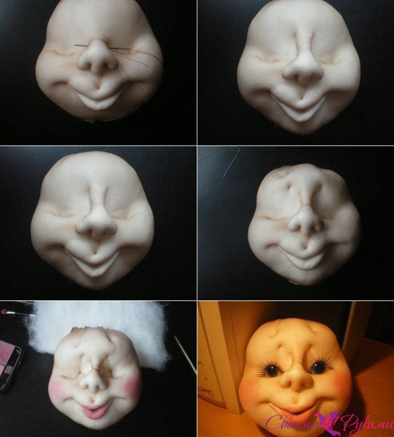 Сначала нужно отдельно сделать голову и сформировать лицо куклы. Делается голова из отрезка колготок, а затем нитками стягиваются отдельные части. Глаза или вышиваются или приклеиваются. В качестве волос можно использовать нитки или старый парик.