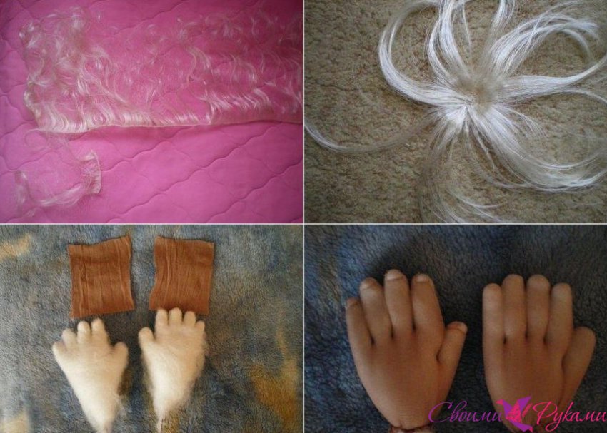 Ладошки делаются из отрезков проволоки, обмотанных синтепоном. Сверху надевается отрезок от колгот. Нитками вышиваются пальчики и ногти.