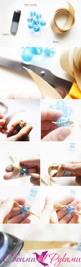 Затем на ленту нанизываем выбранные бусины и с двух сторон туго затягиваем узлы. Если ваши бусины разного размера, то их лучше чередовать через одну или две. Продолжаем надевать бусины на ленту, пока они не закончатся, а у вас не получится великолепный браслет необходимого размера.