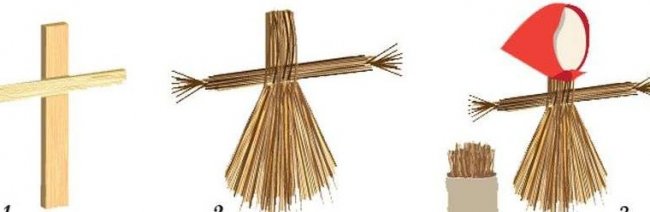 Сперва нужно соединить две палочки и хорошо закрепить солому, украсив нарядной одеждой.