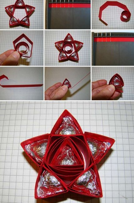 Свое внимание и любовь для мужчины на 23 февраля выразить просто. Можно изготовить звездочку из бумаги и дополнить ее конфетами. Что-бы изготовить этот очень интересный подарок воспользуйтесь инструкцией на фото. Вручать данный подарок стоит обязательно с теплыми пожеланиями.