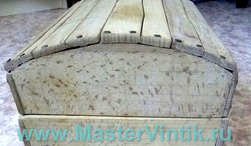 Картонный сундучок подразумевался как каркас для деревянного, а далее встал вопрос – как этот картонный «обшить» деревом? Планки тонкие: 6-8 миллиметров. Ставить саморезы или шурупы в торец – не слишком хорошее решение, да и хотелось собрать на гвоздях — на старых пиратских сундуках саморезов не было ?