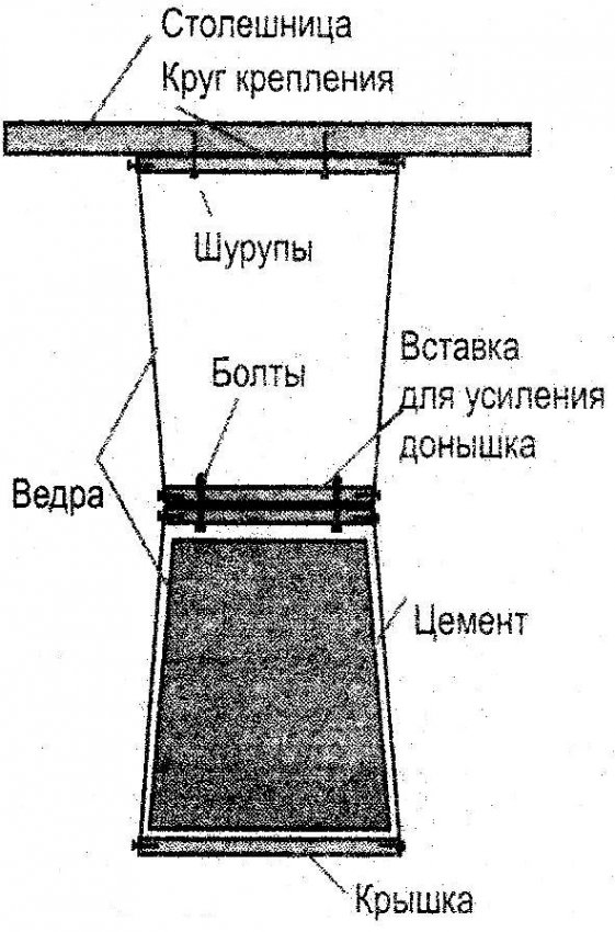 Из двух вёдер (желательно металлических) можно сделать основу для столика. Смотрите рисунок, ниже. Соединяем их болтами дном ко дну. Чтобы столик был устойчивым, нижнее ведро заполняем раствором цемента или глиной и закрываем. Столешницу изготавливаем из любого подходящего материала. В центре, снизу столешницы, крепим шурупами накладку деревянный круг толщиной 15-50 мм, диаметром, равным диаметру верхней части ведра.