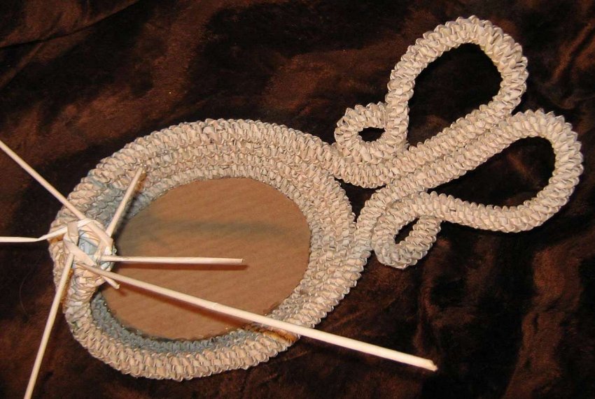 Плетем валик, который будет окружать дно. Приклеиваем ее клеевым пистолетом.