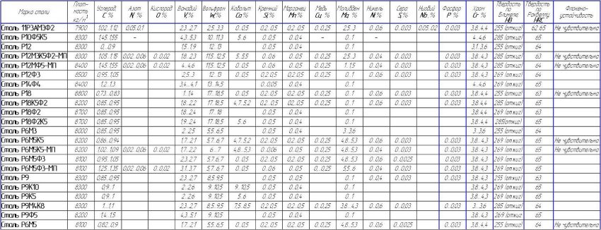 Плотность сталей от 7900 (Сталь 11Р3АМ3Ф2) до 8800 кг/м^3 (Сталь Р18)