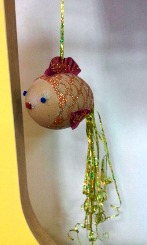 Попробуйте прикрепить к бумажным деталям рыбки, поросенка, клоуна петельку из ниток — получится великолепная елочная игрушка.