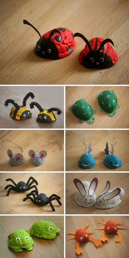 Ниже, смотрите разнообразие идей поделок из скорлупы яиц и грецких орехов, найденных в Интернет:
