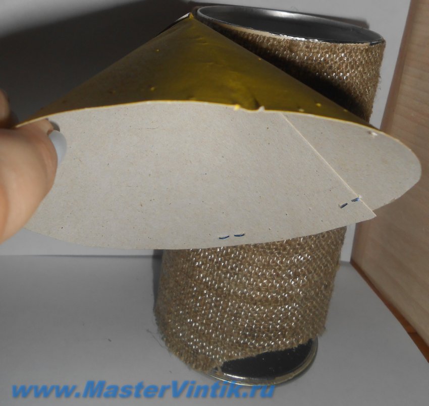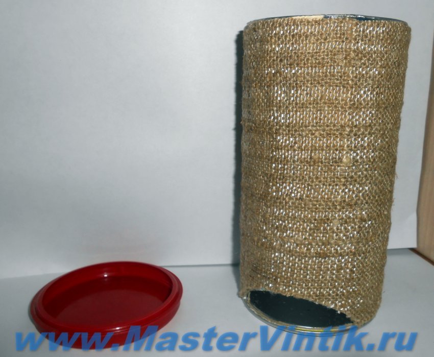 Коробочка была круглой формы. Внизу у основания вырезала дырочку полукругом так, чтобы свободно проходил чайный пакетик. Оклеила коробку мешковиной.