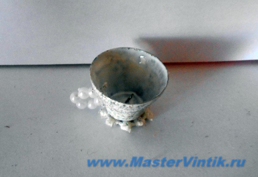 Сверху украсила лаком для ногтей с блестками. На проволоку нанизала 6 белых бусин и приделала к чашке в качестве ручки. Ко дну чашки приклеила цветок из белого кружева.