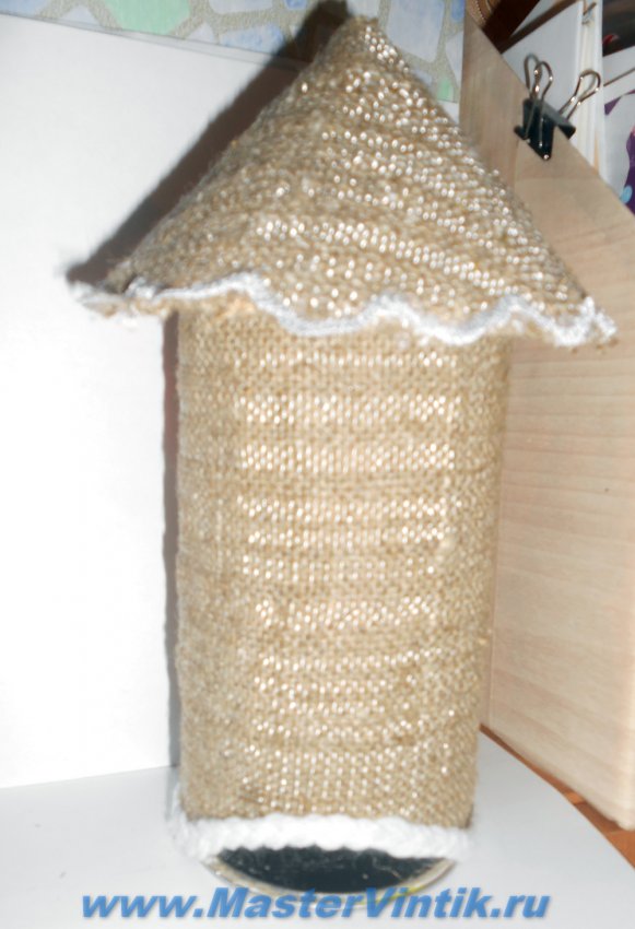 Крышу обклеила мешковиной и украсила по краю белой нитью.