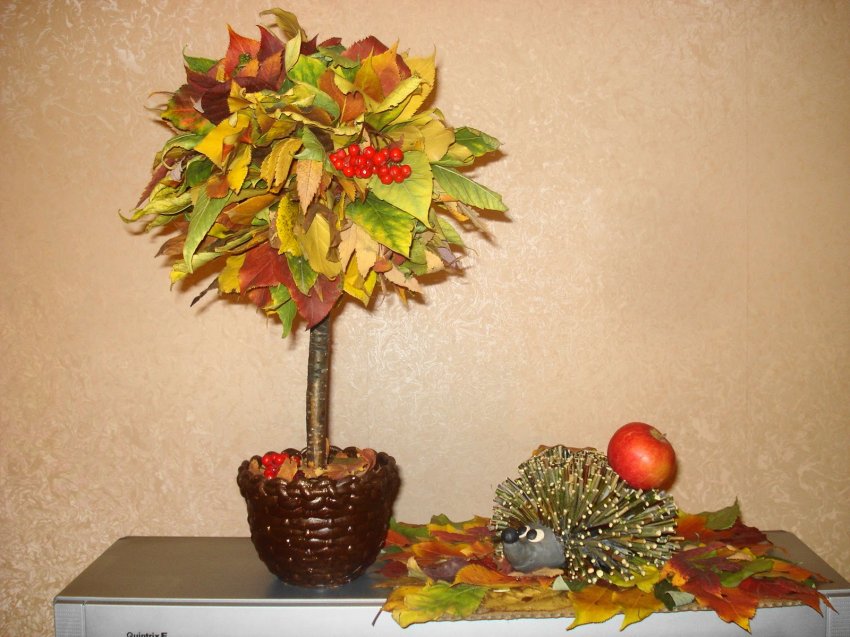 Топиарием называют маленькое декоративное дерево, призванное быть украшением интерьера. Подобный аксессуар, сделанный из красивых осенних листьев, добавит обстановке уюта и тепла. Использовать можно не только опавшую листву, но и сухоцветы, колосья, шишки, высушенные ягоды, жёлуди. Выбор материала зависит от вашей фантазии. Важно лишь грамотно определиться с основой.