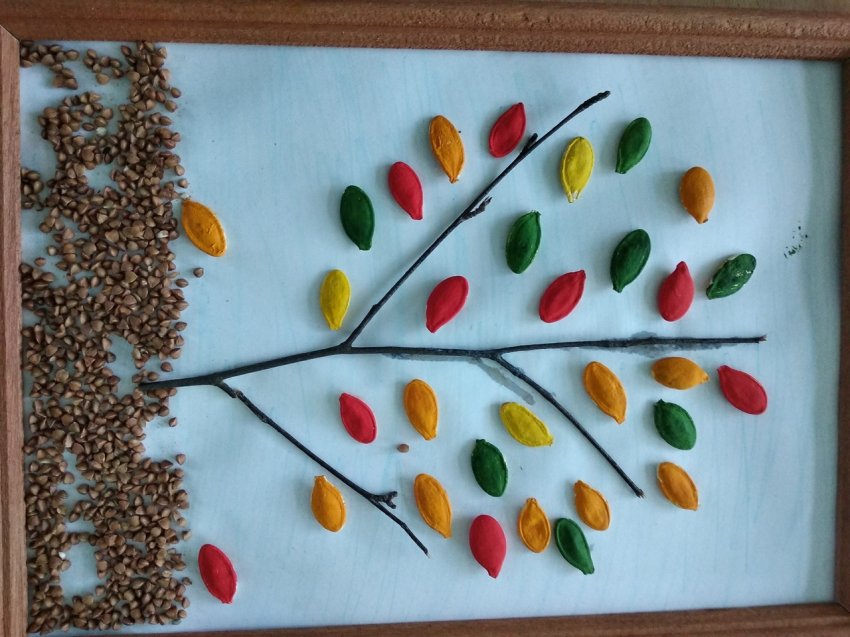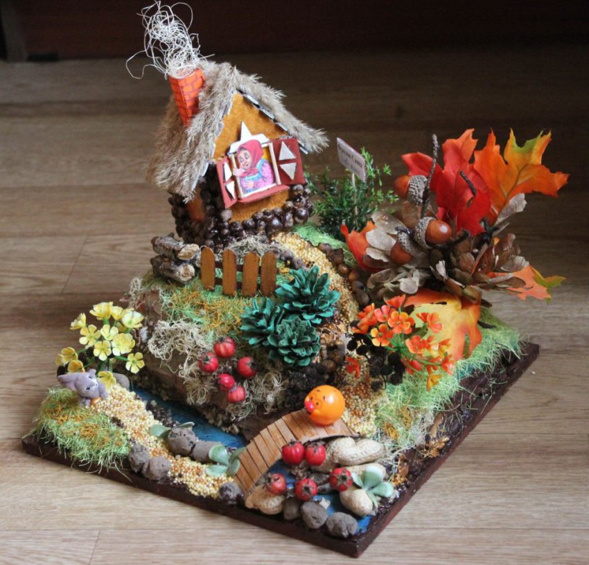 По душе ребятишкам придётся и изготовление тематических композиций, изображающих, к примеру, сцены из сказок и мультиков. Здесь всему найдётся место – шишкам, каштанам, сухому гороху, фасоли, тыкве, веткам, листьям, мху, гальке. А поселить в объёмную «картину» можно игрушки из киндер-сюрприза.
