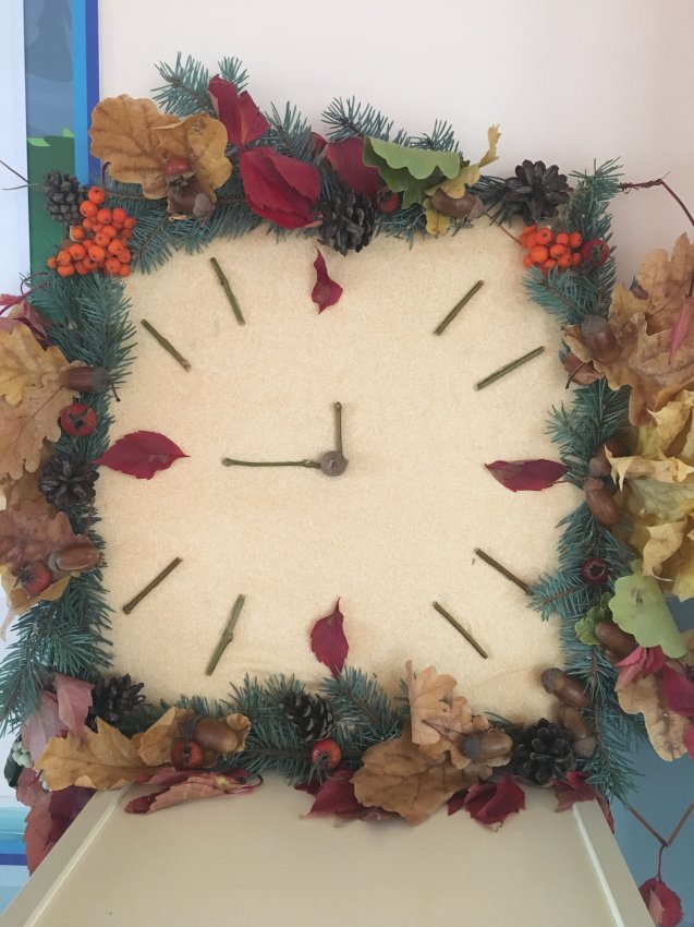 Ещё можно совместно с чадом сделать природные часы. Смотрится такая поделка для детского сада великолепно. Вам потребуется лист картона, ветки, каштаны, разные листья, клей. Из картона вырезаем циферблат. Ветки приспосабливаем под стрелки. Из сучьев выкладываем римские цифры. Каштаны используем для обрамления, а листья – для фона. Все детали крепим к картонной заготовке при помощи клея. Вот и всё!