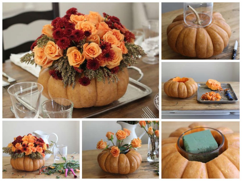 Сортовое изобилие декоративных тыкв поражает воображение. Желтые, оранжевые, серо-зелёные, полосатые – они весьма гармонично сочетаются друг с другом. Самая простая композиция представляет собой плетёную корзинку, наполненную этими овощами, более сложная – стильные подсвечники для обеденного стола.