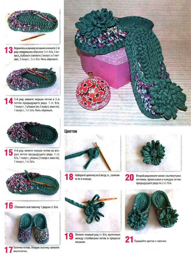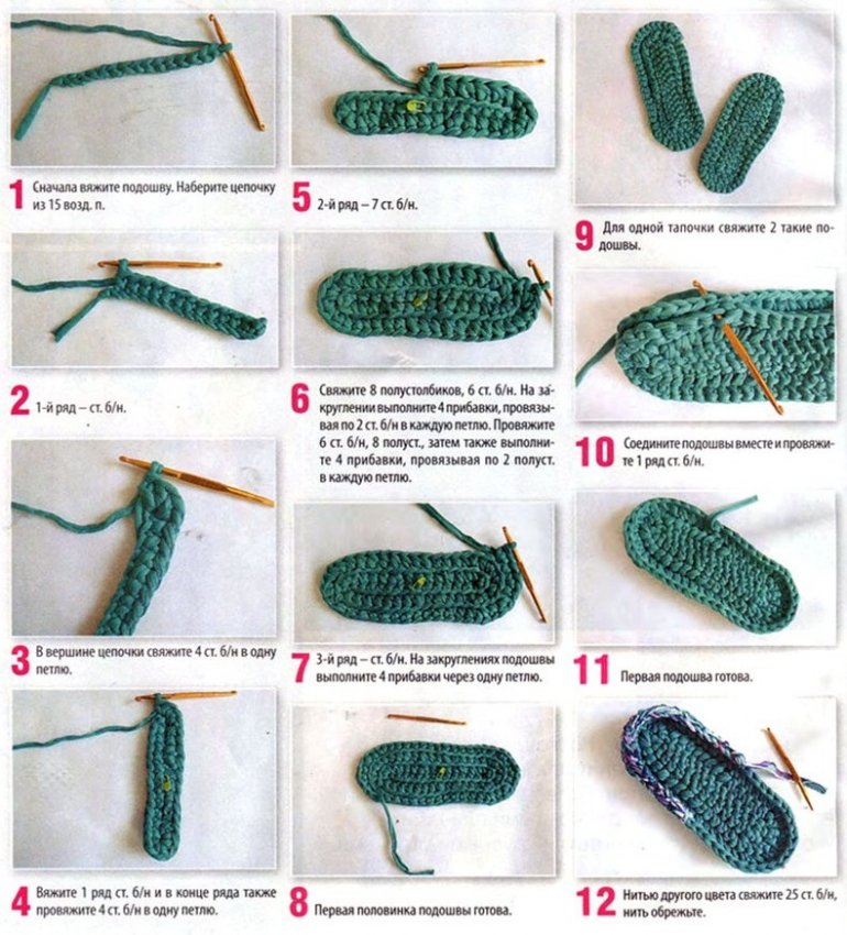 - Домашние тапочки. Удобные, легкие, приятные на ощупь тапки, за которыми просто ухаживать. Они могут быть закрытыми, шлепанцами, сланцами. К трикотажной подошве можно пришить более твердую, а верх украсить декором.