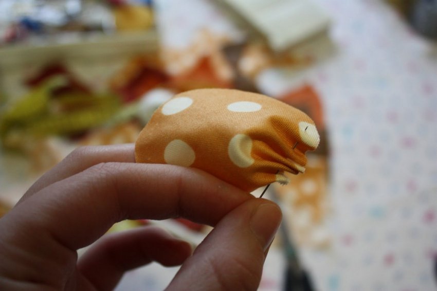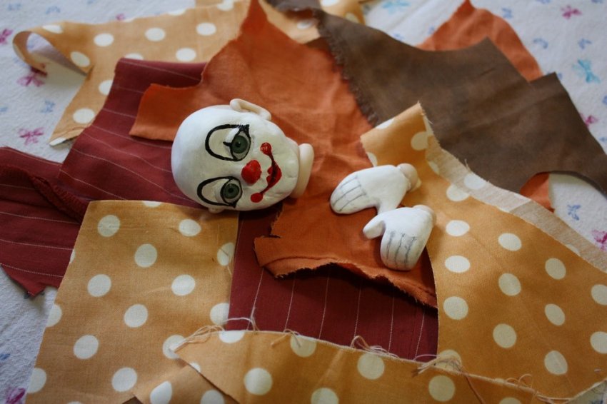 Откопала все имеющиеся у меня обрезки (то, что отсталось от недавно сшитого домового) + соорудила голову и руки для клоуна (голову и руки также можно сшить).