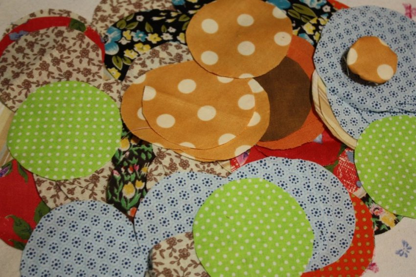 Мне потребовались кусочки тканей размером 6х6 см, из которых получатся в дальнейшем кругляшки того же диаметра. Расцветка не принципиальна, чем пестрее и разнообразнее, тем лучше. Главное, чтоб край не очень бахромился.