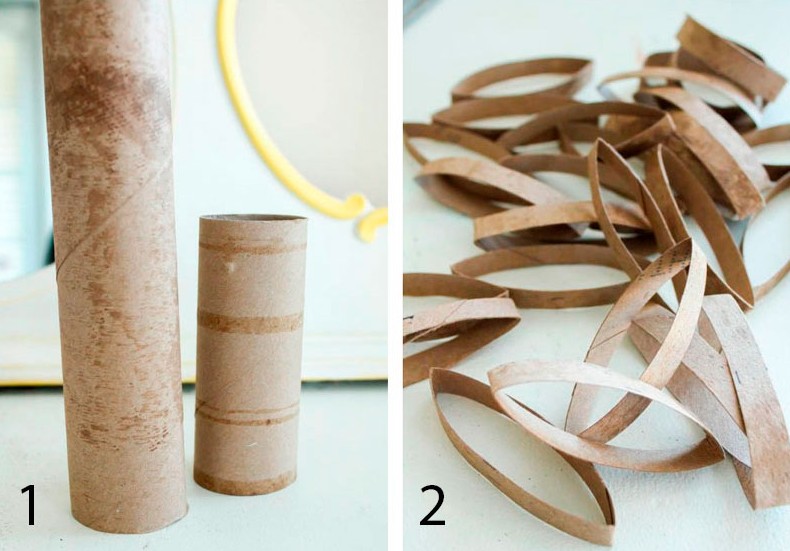 Вам понадобится: втулки от туалетной бумаги либо бумажных полотенец, ножницы, шпагат либо верёвка, палка, клей пва, для декора – блёстки либо страницы книг.