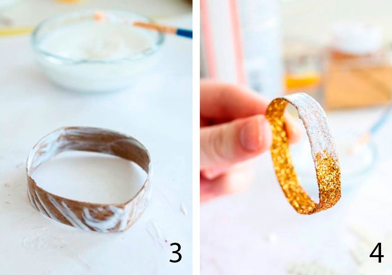 - Нанесите клей на одну деталь, посыпьте блёстками либо приклейте кусочек страницы и оставьте высыхать.