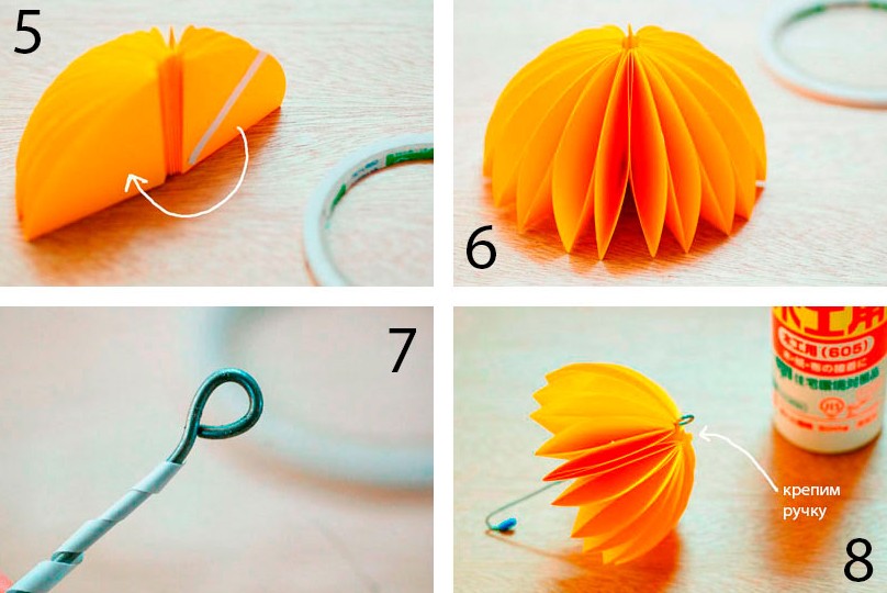 - Склейте остальные заготовки между собой по кругу, сформировав верхнюю часть зонтика.