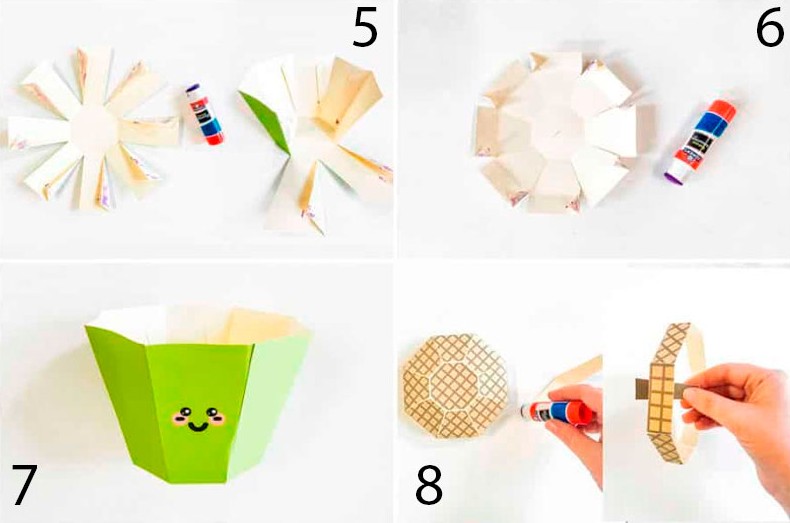 - Закрепите каждую заготовку в верхней круглой части клеем, чтобы она была раскрыта только снизу, а сверху не раскрывалась.