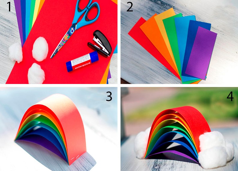 - Приклейте по 3 ватных шарика у основания радуги в качестве облаков.