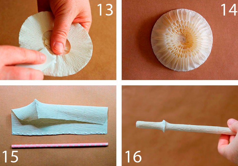 - Обклейте гофрированной бумагой соломинку и приклейте её в качестве ножки гриба.