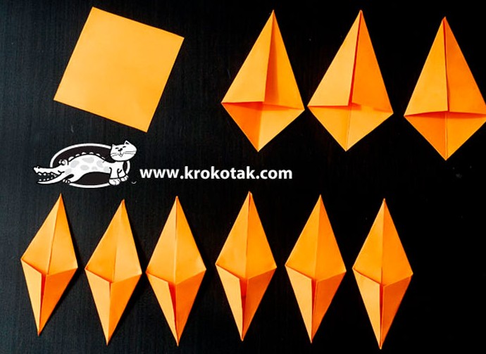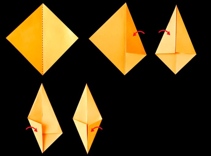 - Возьмите один квадрат и сложите, как показано на фото-инструкции. Должен получиться ромб.