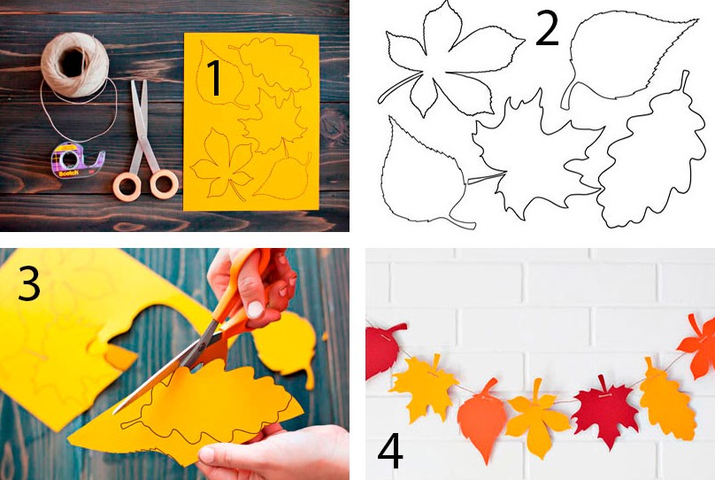 Вам понадобится: цветная бумага либо картон, простой карандаш, шаблоны листьев, ножницы, иголка, скотч, тонкая верёвка.
