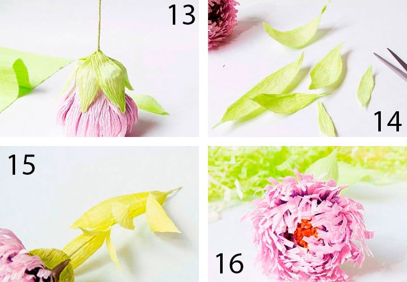 - Вырежьте 6 чашелистиков из зелёной бумаги, затем приклейте их.