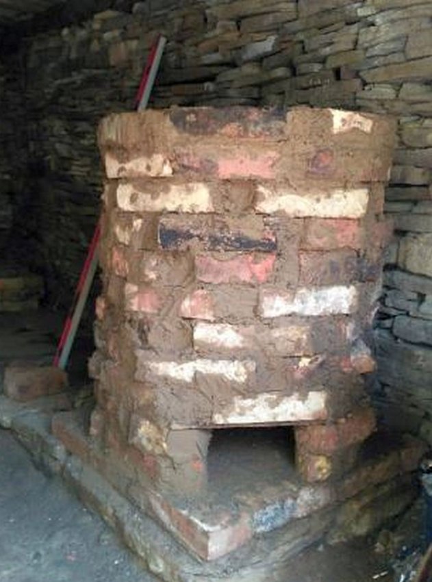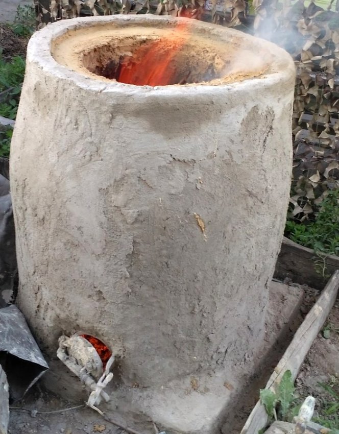 За четыре дня тандыр из кирпича был готов. Естественно большую часть времени заняла промежуточная сушка. После завершения строительства и изготовления приспособления для подвешивания я приступил к обжигу. Тандыр наполнил дровами наполовину, накрыл крышкой и установил трубу. Через поддувало поджог дрова и стал наблюдать за процессом горения. Тандыр практически не дымил, весь дым улетал в трубу, благо тяга была хорошая. Через полтора часа дрова превратились в раскаленные угли. Чтобы тандыр прогрелся как следует, а тепло не вылетало через дымоход, трубу я зафиксировал в верхнем положении, а поддувало и отверстие в крышке закрыл.