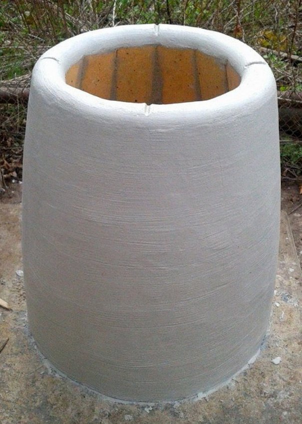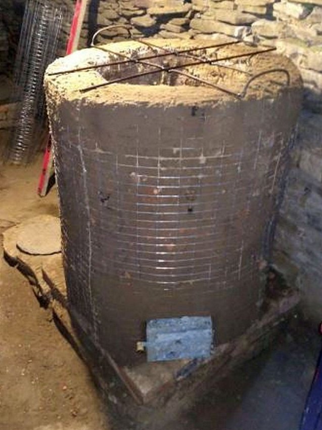 Снаружи тандыр я обмазывал тем же глиняным раствором на котором и был сложен тандыр. Сначала набросал первый слой раствора, чтобы сгладить углы и немного выровнять стенку. На свежий раствор обвернул тандыр сеткой (5х2 см). На следующий день нанес второй слой и выровнял его шпателем. Верх тандыра также обмазал раствором сделав выемки для подвешивания шампуров и буртик для крышки.