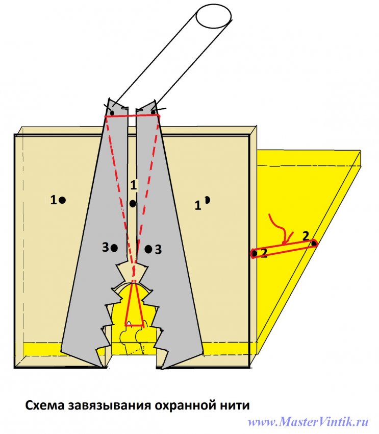 Схема завязывания охранной нити выполнена так, чтобы максимально препятствовать доступу к приманке без перегрызания.