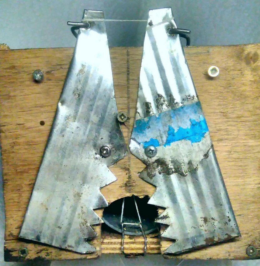 Можно взять два кусочка оцинковки. Отверстия : левое по эскизу – под диаметр пружины, правое — под диаметр самореза. Расположение отверстий показано справочно. Можно сделать сначала челюсти из плотного картона и уточнить их положение на передней панели, заменяя пробные оси вращения иглами.