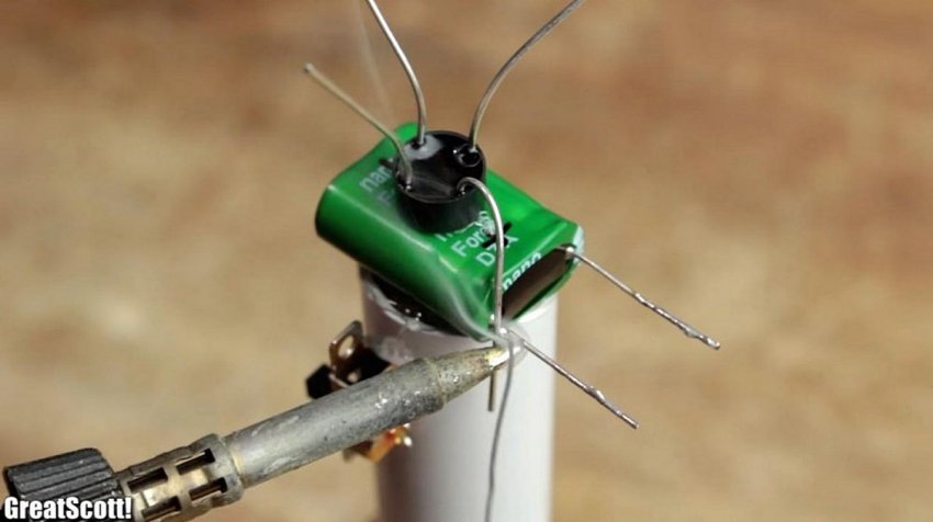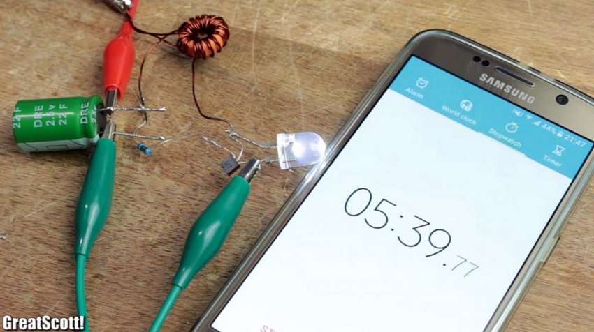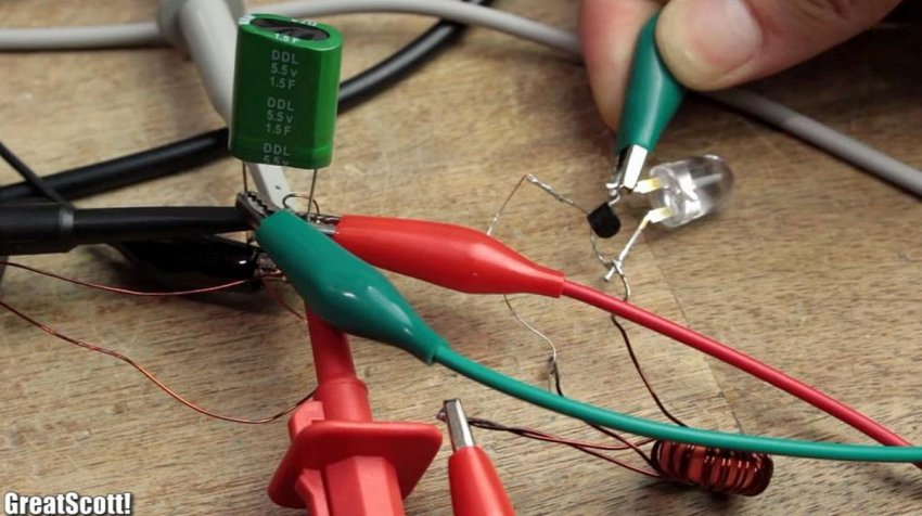 Повышающий автотрансформатор поможет преобразовать низкие спонтанные импульсы от первичной катушки в достаточное напряжение для работы светодиода за счет самоиндукции одной из обмоток – коллекторной. Так как она связана с базовой обмоткой, постоянный и стабильный электрический ток будет подаваться на суперконденсатор в достаточном количестве. Резистор же ограничит превышение допустимых номиналов. Конденсатор достаточной емкости также подобран автором опытным путем с помощью замеров исходящих сигналов осциллографом.