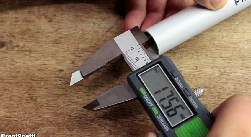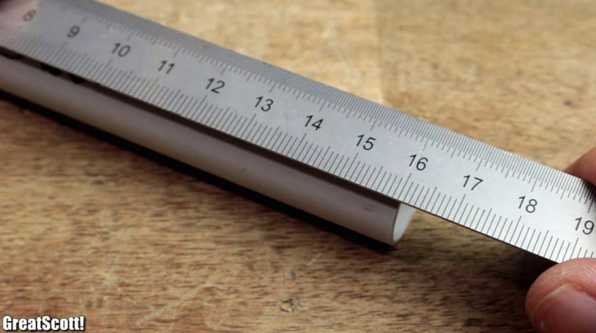 Корпус фонарика будем делать из ПВХ трубы. Отмечаем отрезок длиной 16 см, и отрезаем его ножовкой по металлу.