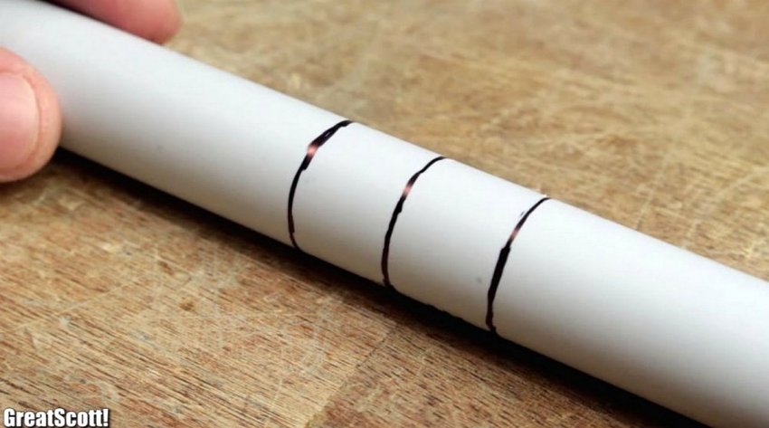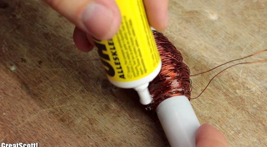 Далее берем медный провод сечением 0,5 мм, оставляем один конец его длиной около 10-15 см, и наматываем проволоку на трубку-корпус фонарика по разметке вручную. Мотать придется довольно много, более полутысячи витков. Первые несколько из них можно зафиксировать клеем. Начальный ряд катушки плотно прижимаем друг к другу, и делаем его строго последовательным.