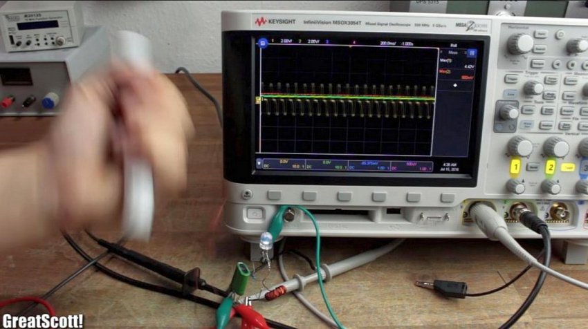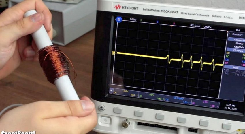 По шкале осциллографа можно увидеть разницу между потенциалами, получаемыми от колебаний одного и десяти магнитов. Автор получил от колебаний магнитного стержня напряжение в 4,5V. На ней также ясно видна цикличность синусоиды в интервалах изменяющейся частотности.