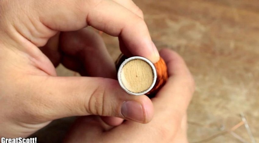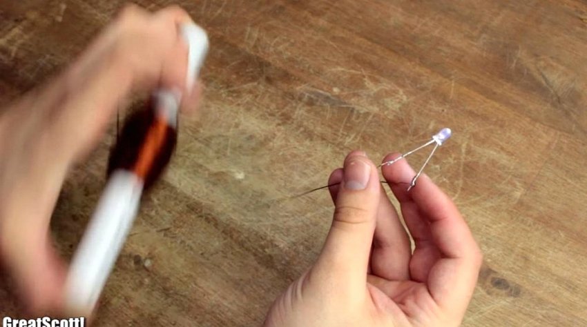 На этом этапе, по примеру автора, можно подключить напрямую к выходящим концам катушки светодиод, и проверить ее работоспособность. Как видно на фото, светодиод реагирует на перемещение магнитного стержня, и создаваемый им самим импульсный ток.