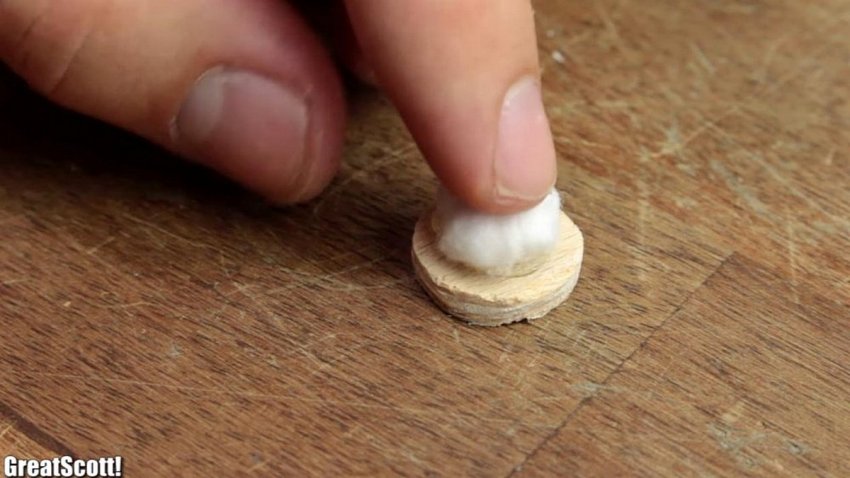 Теперь необходимо заглушить оба конца трубки, чтобы не придерживать их руками во время тряски. Для этого той же ножовкой выпиливаем из фанеры несколько пятачков, обрабатываем грани напильником, прокладываем ваткой с тыльной стороны для смягчения и сажаем их на клей, чтобы не вываливались.