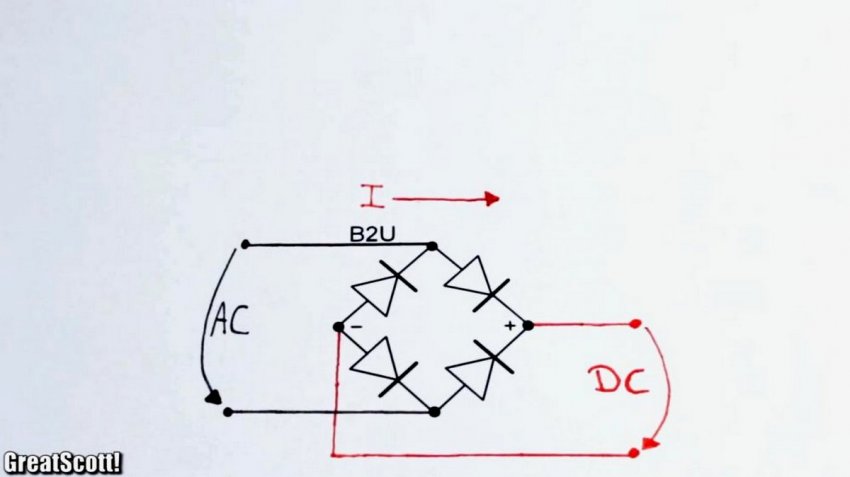 Настала очередь подключить выпрямитель. Схема, отображенная на фото, показывает какие два его контакта из четырех подключить к катушке. Такой диодный мост способен принимать переменный ток, и выдавать постоянный строго в одном направлении.