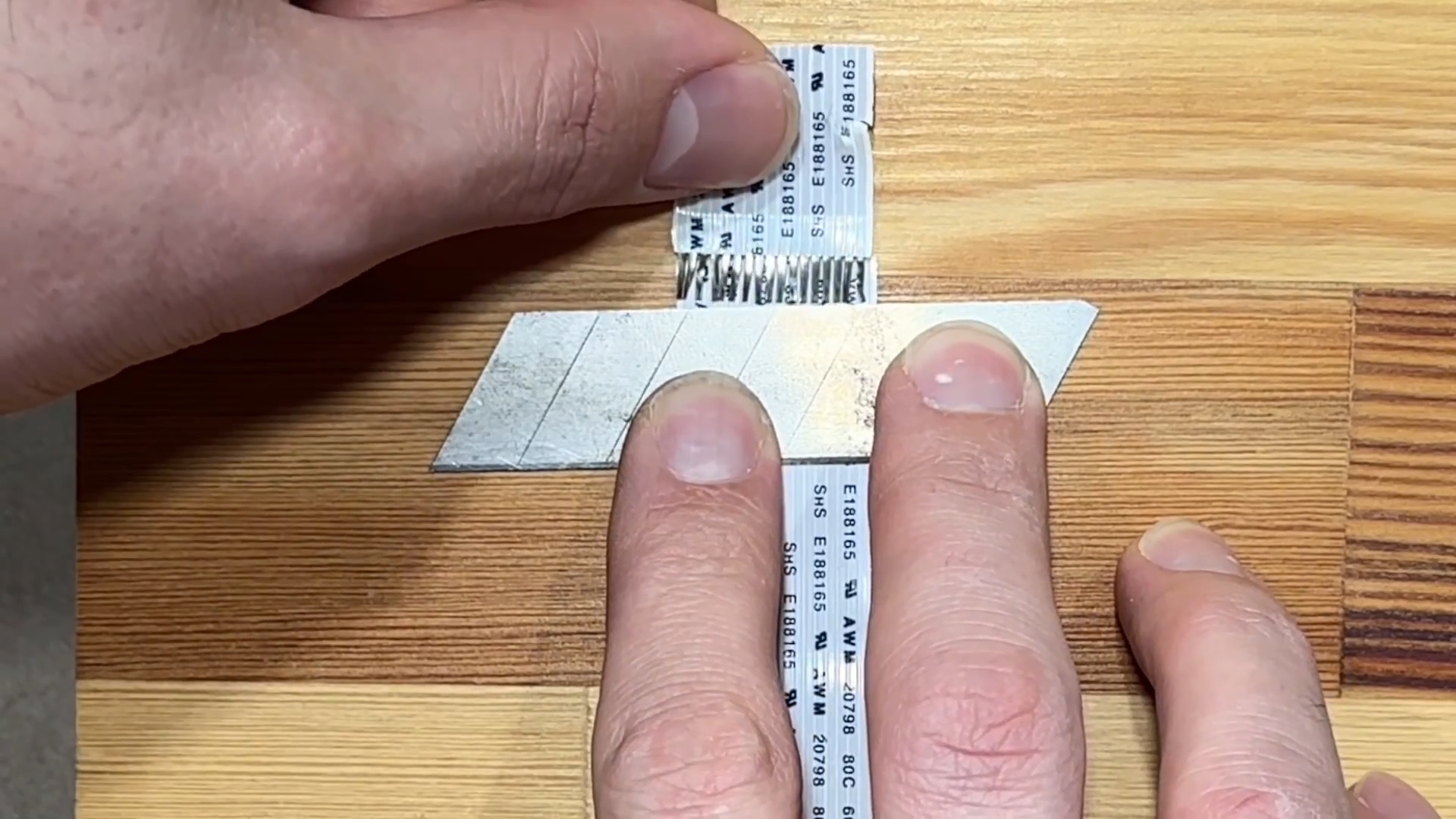 Далее на твёрдой и ровной поверхности располагаем шлейф и при помощи лезвия от канцелярского ножа поочерёдно зачищаем один контакт за другим.