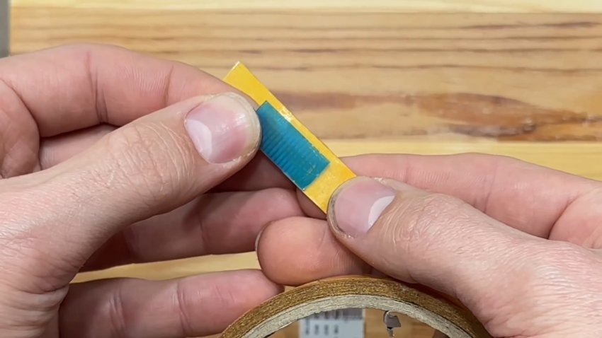 Обрезаем края, отлепляем защитный слой скотча и приклеиваем к зачищенном концу шлейфа.