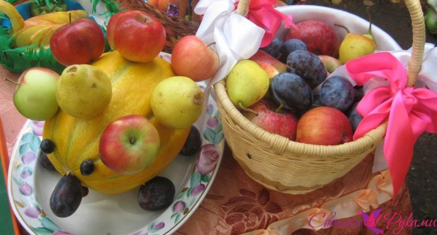 К Яблочному Спасу поспевают разнообразные фрукты. И именно их стоит использовать для создания нашей следующей поделки. Для такого чудесного изделия используют: