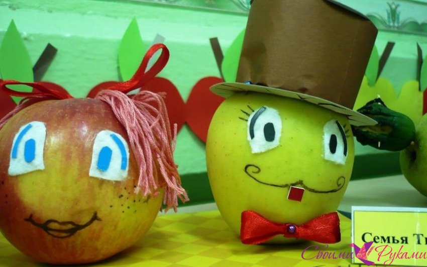 В этой статье мы изготавливаем поделки с детьми к Яблочному Спасу. Детишкам такое занятие обязательно понравится. Для следующей поделки пригодится 2 яблочка. На одном рисуют усы и другие черты лица. К другому приделывают волосы и рисуют также носик и мордочку. А для яблочка мужского пола изготавливается шляпка-цилиндр.