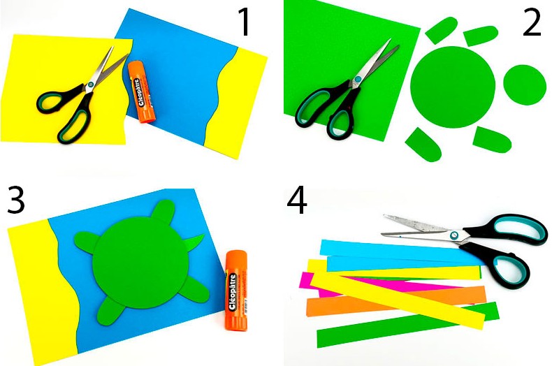 - Вырежьте 2 круга (тело и панцирь), 4 лапки и хвостик из зелёной бумаги, затем приклейте их.